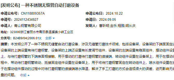 2024年10月22日,青山鋼管有限公司成功申請一項(xiàng)名為“一種不銹鋼無縫管自動打磨設(shè)備”專利,申請公布號為CN118809357A,申請日期為2024年9月5日。