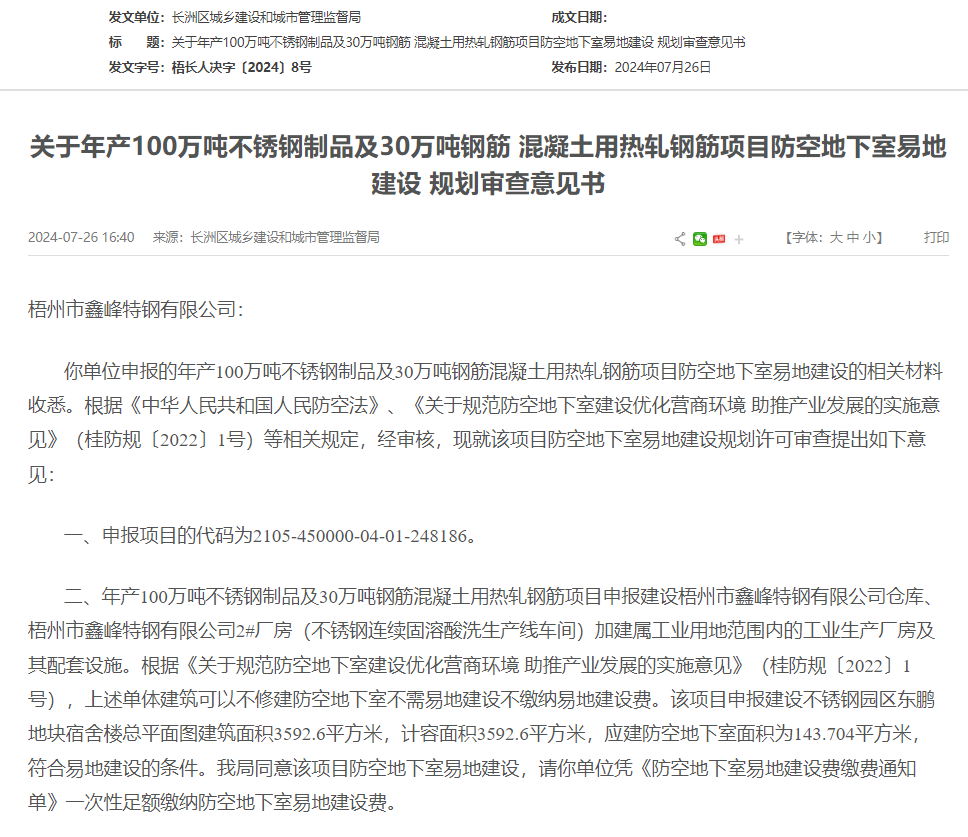 7月26日,梧州市鑫峰特鋼有限公司年產100萬噸不銹鋼制品及30萬噸鋼筋混凝土用熱軋鋼筋項目防空地下室易地建設規劃獲審查意見,據顯示,獲同意通過。