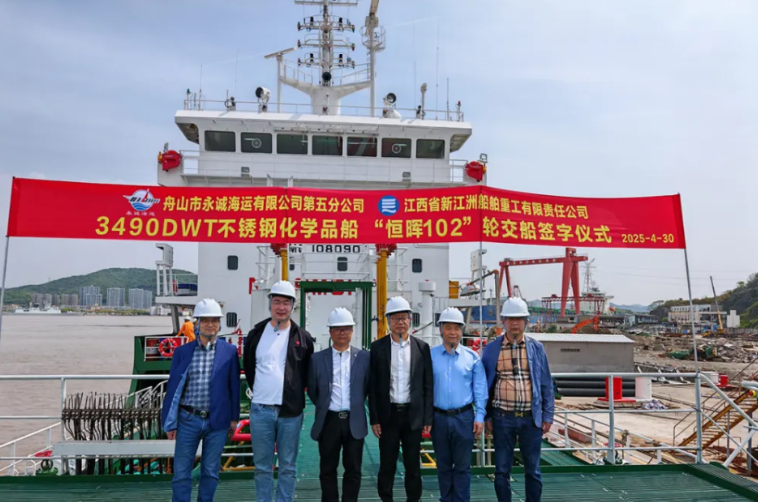 4月30日,江西省新江洲船舶重工有限責任公司承制的3490DWT不銹鋼化學品船(NJZ1116)在舟山市順利簽字交船。